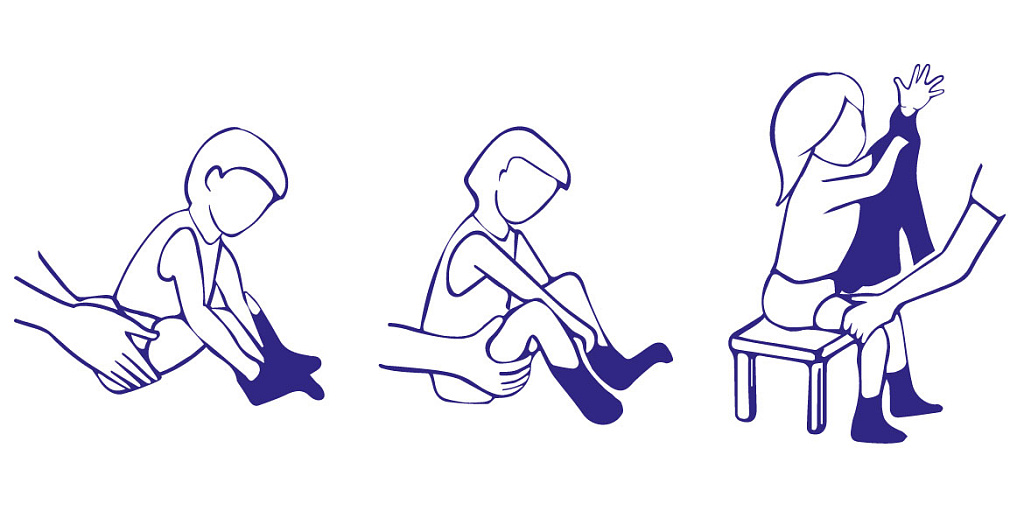 Одевая ребенка, выбирайте такую позу, при которой спастичность будет выражена минимально и не возникнут неконтролируемые движения. Рекомендуется предварительно расположить предметы гардероба так, чтобы их несложно было достать. Всегда давайте ребенку возможность самому делать то, с чем он способен справиться. Даже если на это потребуется много времени. На начальном этапе нужно дробить каждое задание на небольшие шаги. Поначалу малыш будет сам выполнять только финальную часть задания, заканчивая начатые мамой действия. Когда ребенок уже начинает говорить, просите его называть все действия. Позднее можно будет включать в разговор названия цветов, сравнивая цвет одежды с цветами иных предметов в помещении.
